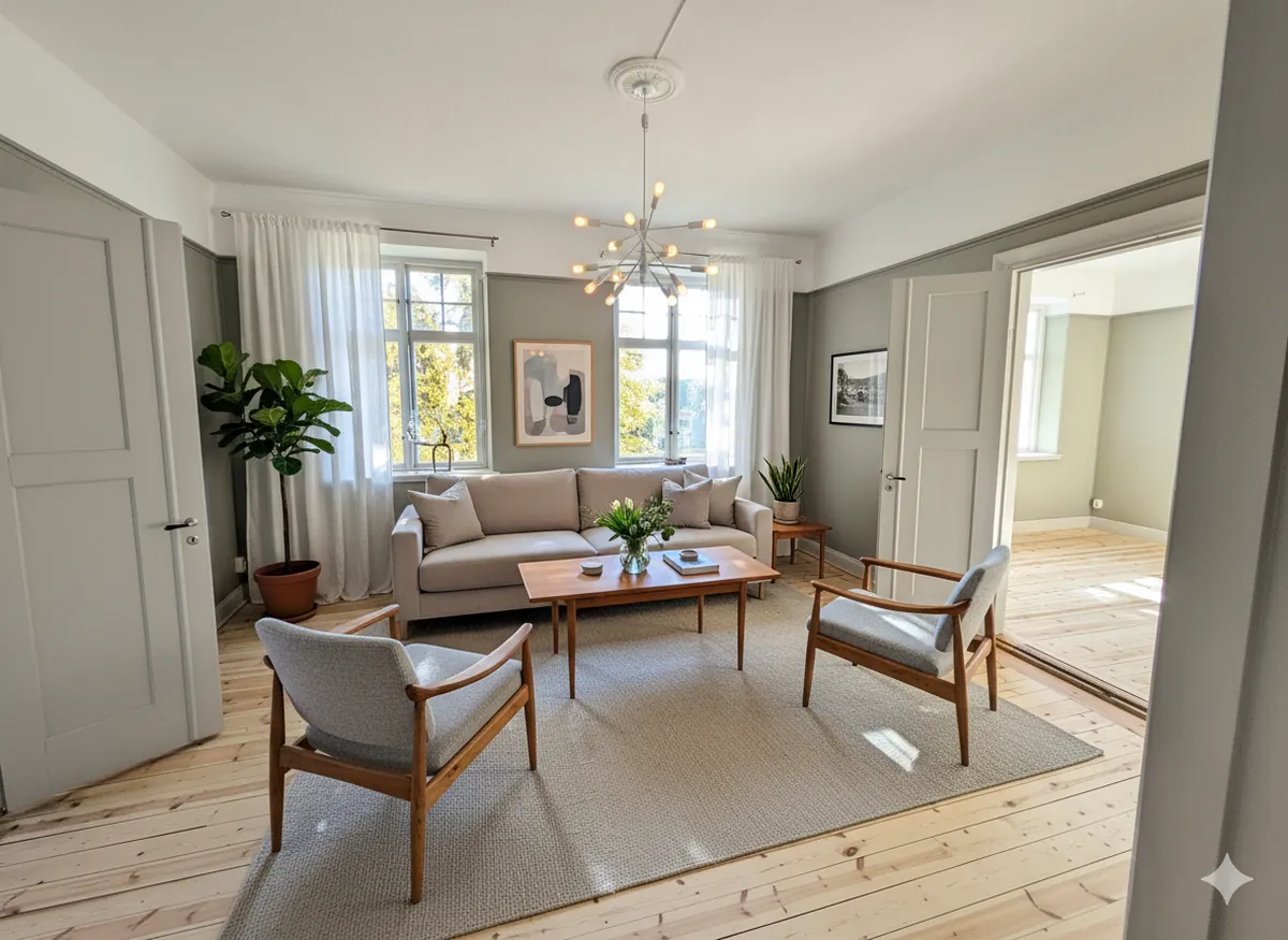 Foton är tagna i den faktiska lägenheten, inredning tillagd med AI.